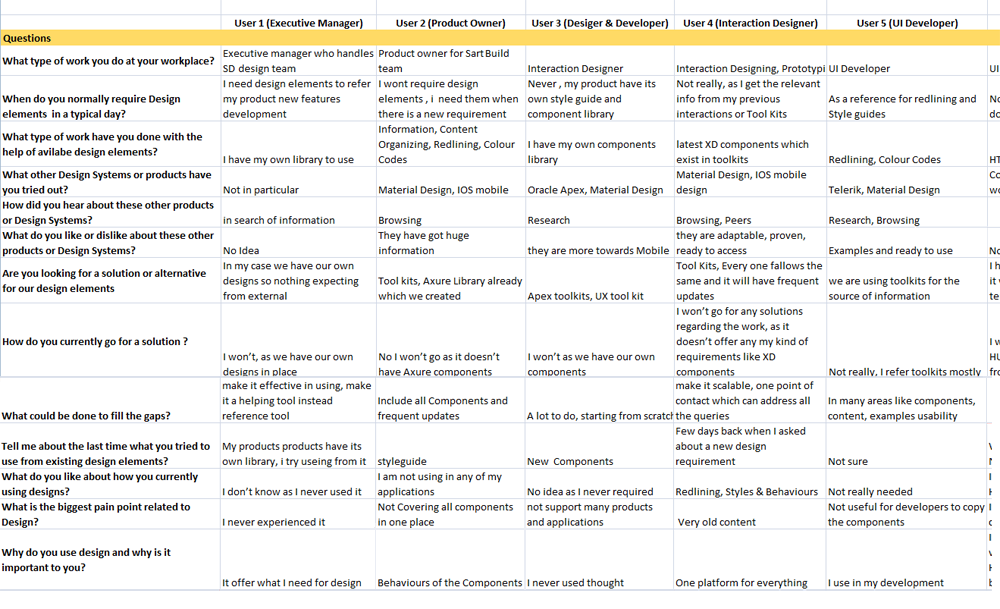 Once we finalized the user groups i tried to understand the actual problems of users relating to UI, Style guides and Graphic libraries of the projects they are working.