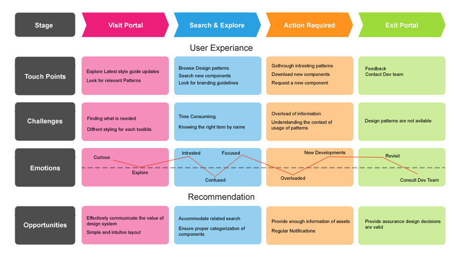 User journey map developed to uncover the pain points as well as explore opportunities to make improvements.
