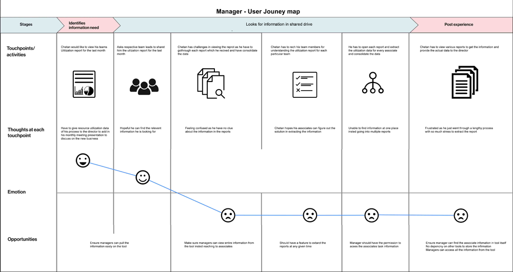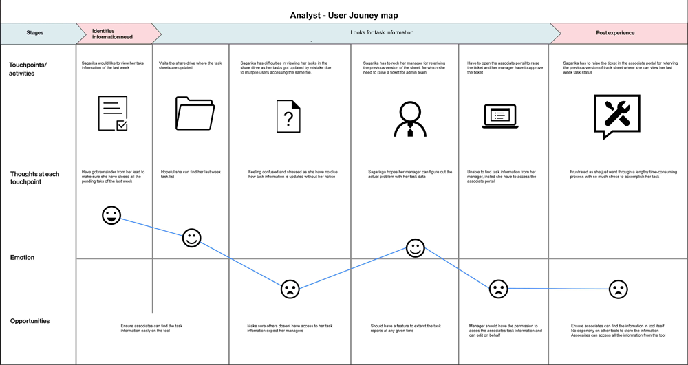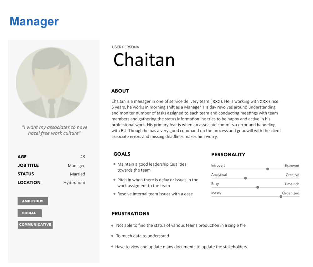 We have chosen few users randomly from various teams and tried to understand the actual problems of users relating to tasks, work allocation, Nature of task they are doing and Daily, Weekly and monthly report of the associates. Personas created to gather the requirements and pain areas of users who are fallowing the current process to eloborate in detail.