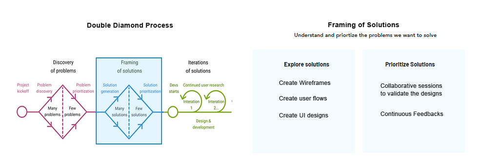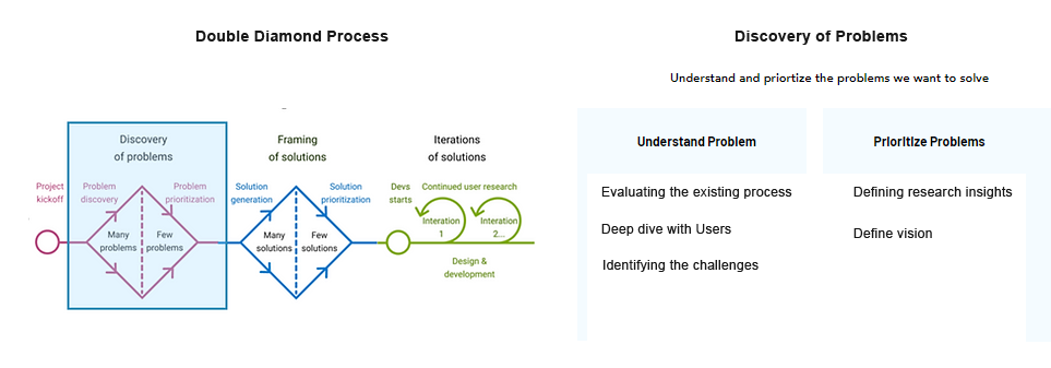 To create a solution for this request I took the double diamond approach of design thinking process. The reason behind choosing this approach is that it gives a perfect model of looking at the existing process and understanding the opportunities in it and at the same time explore all the different solution options and at the same time test it with the users at every step of the time process.